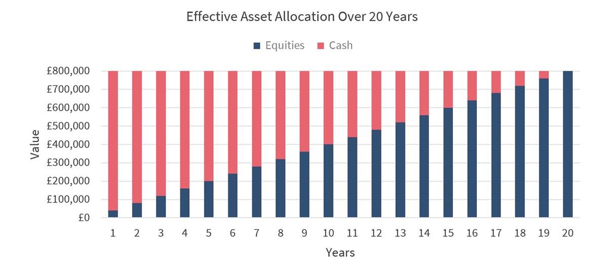 In total then, she will eventually make contributions of £800,000 into her pension but on day one, she is only contributing £40,000. Therefore, even if Lucy invests 100% of her first year’s contribution into equities, it will still represent an equity allocation of just 5% of her future retirement pot. The remaining 95% (£760,000) is still effectively sat in unearned cash.